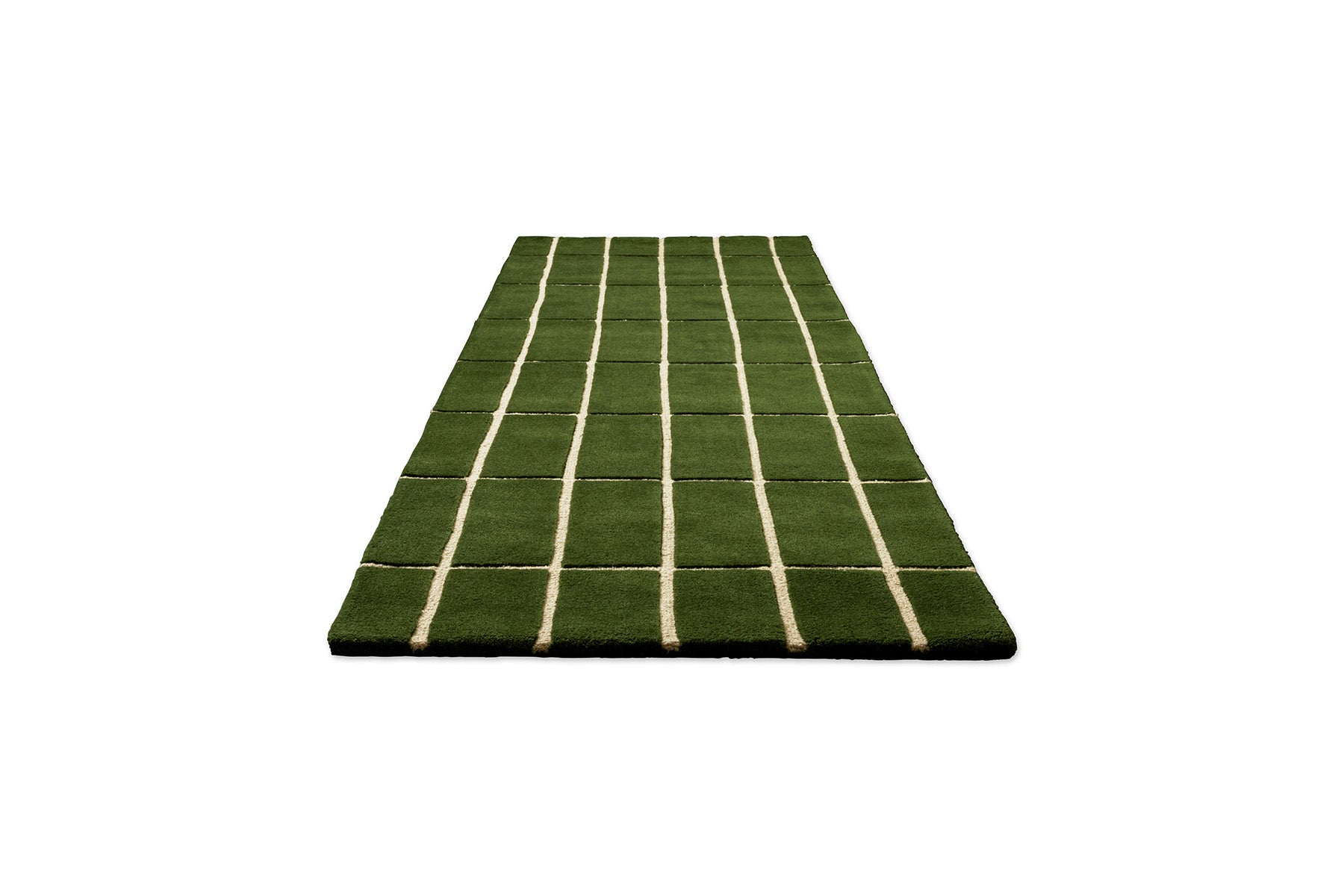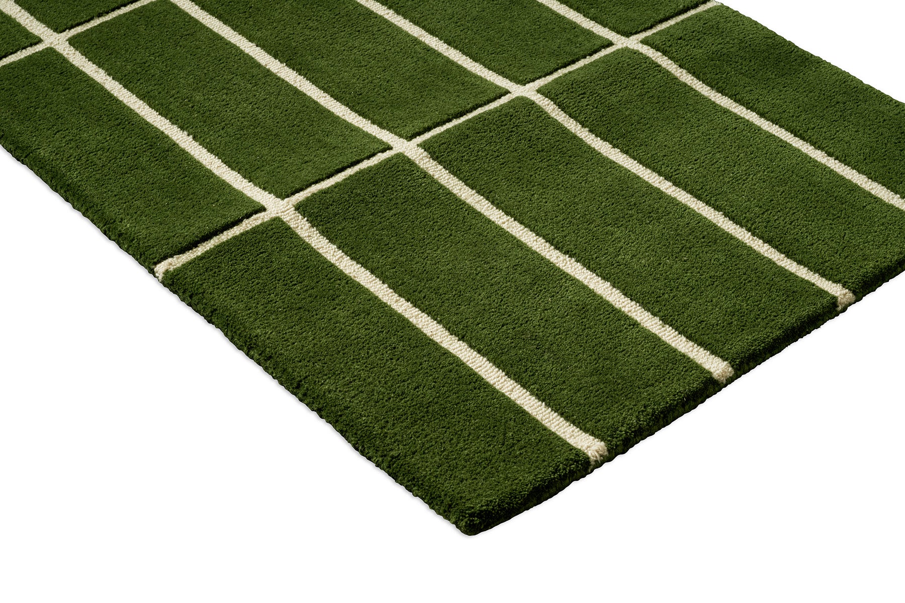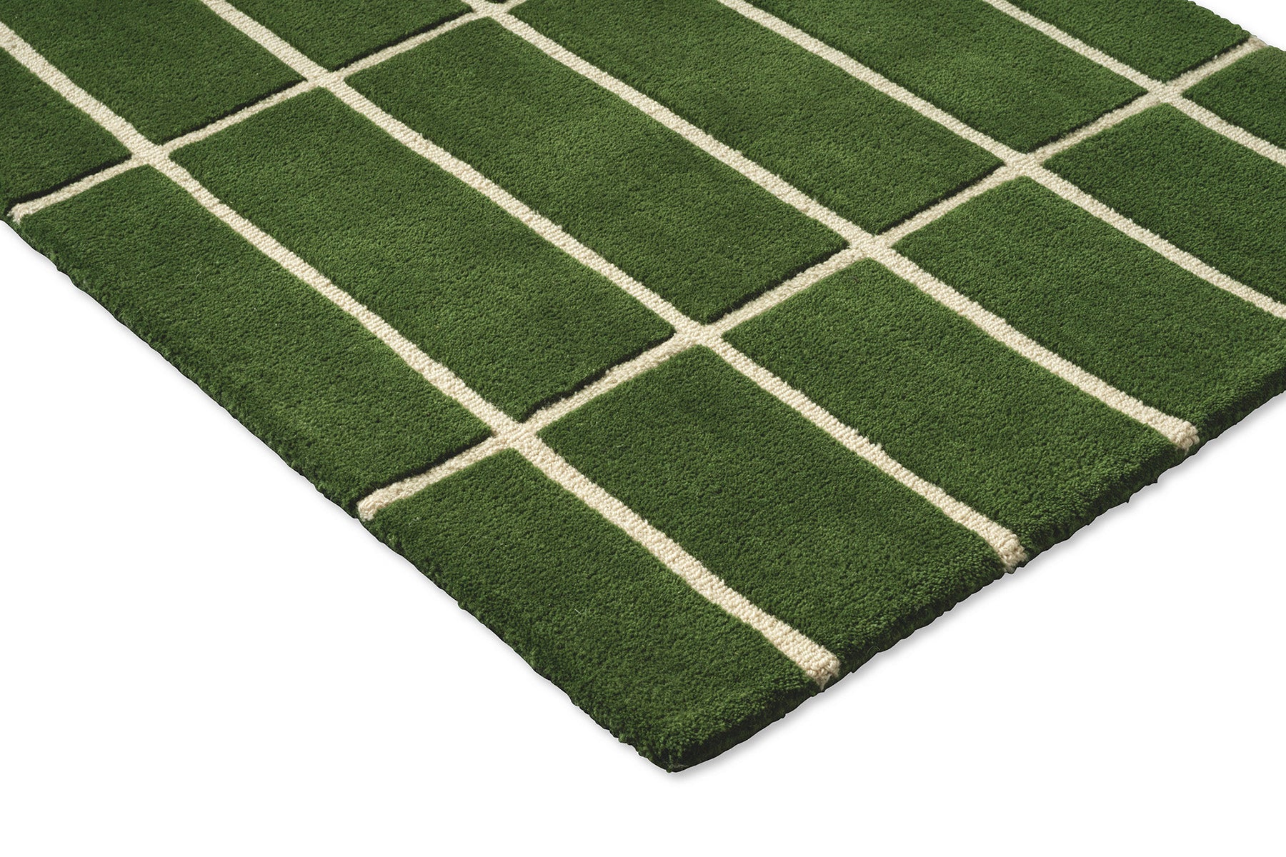 Bring deep, natural elegance and architectural poise to your space with the Marimekko Tiiliskivi Green rug style 132907, a hand-tufted work of understated luxury crafted in India from 100% high-quality New Zealand wool. This refined geometric pattern, named after the Finnish word for "brick" tiiliskivi, presents a perfectly proportioned grid of rectangular blocks, each one richly raised and sumptuously textured to form a rhythmic, sculptural surface that captures light and shadow with quiet sophistication. The lush forest-green field is crisply delineated by slender off-white lines, creating a striking yet harmonious contrast that feels both timeless and contemporary. The plush, dense wool pile delivers an exceptionally soft, velvety underfoot sensation, combined with outstanding durability, natural warmth, subtle acoustic comfort, and a luxurious dimensional depth that invites barefoot indulgence. Perfect for living rooms, studies, bedrooms, or any interior that values structured beauty, rich natural colour, and sophisticated Scandinavian restraint, this piece quietly elevates the floor into a statement of refined, organic luxury.