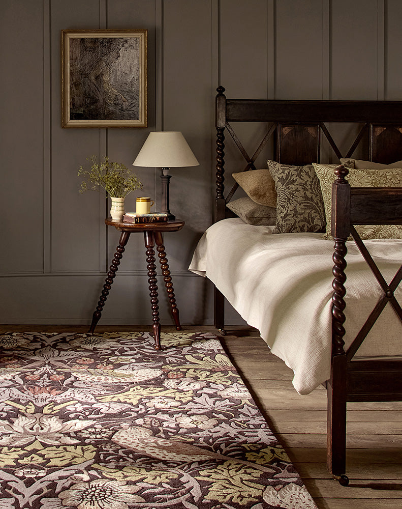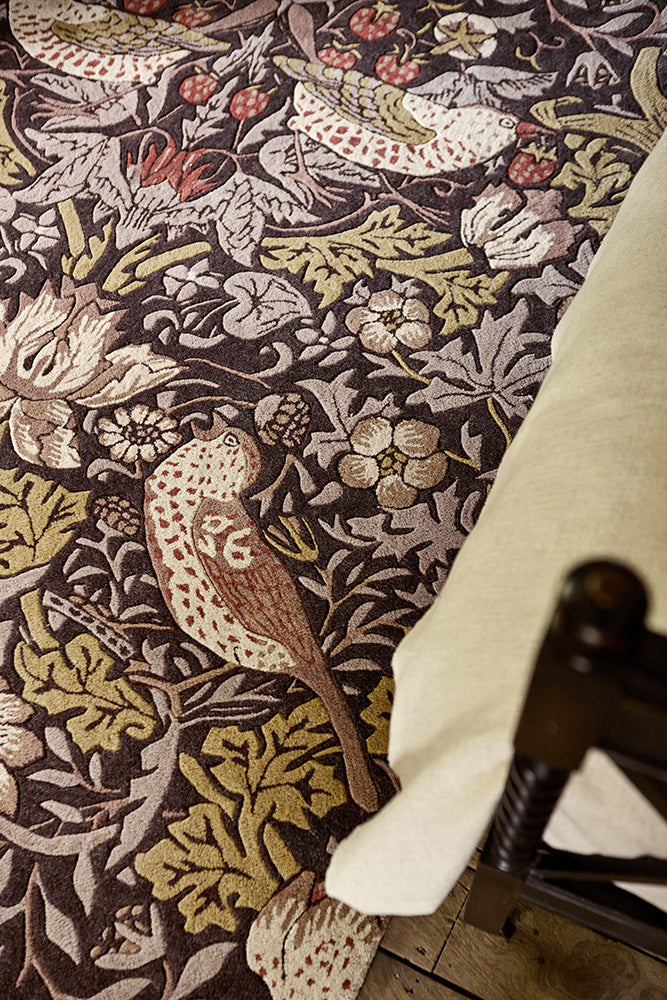 William Morris designed Strawberry Thief in 1881, inspired by a thrush he saw stealing fruit from the garden at Kelmscott Manor. One of Morris & Co.'s most beloved designs, it is beautifully reimagined here as a richly patterned hand-tufted rug in grape tones. Crafted in India using 100% pure new wool, this rug features a 17mm pile.