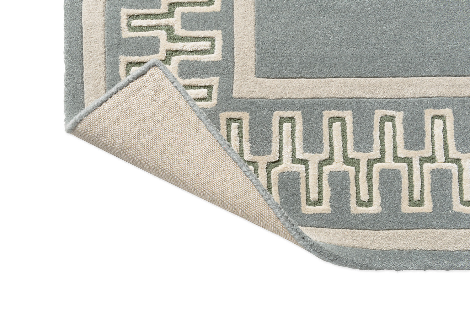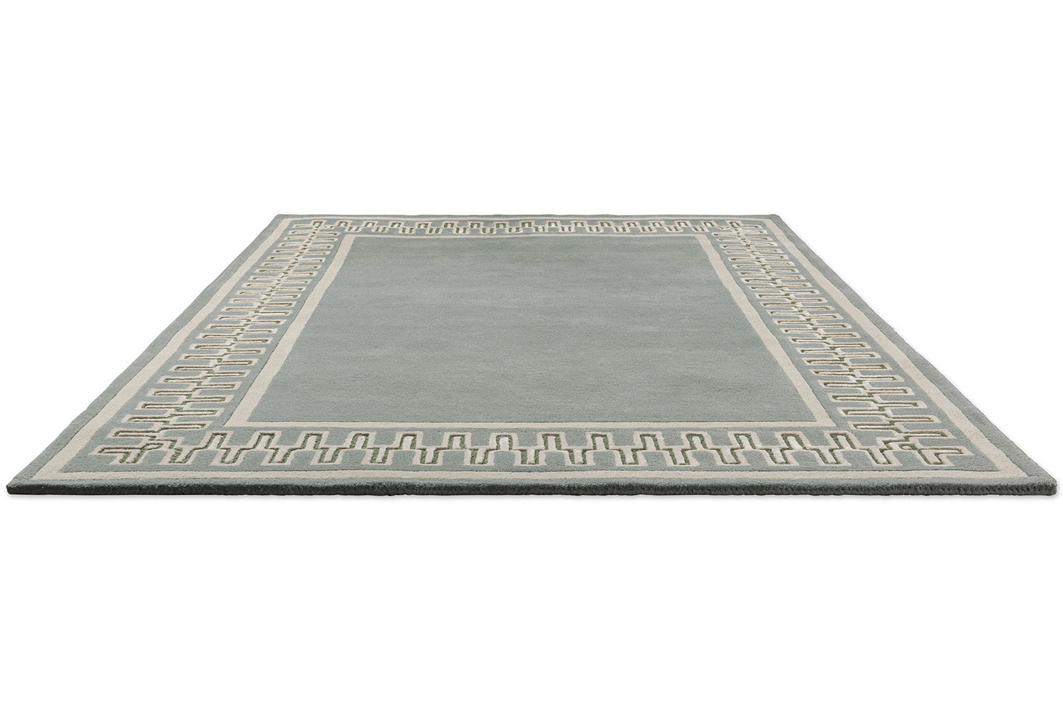 A playfully geometric border, echoing patterns from classical antiquity, frames this hand-tufted rug, set in smart contrasting tones of jade and flax. Handtufted in India, this rug comprises of 92% pure new wool, an 8% viscose blend with a 17 mm pile for a subtle sheen and softness.